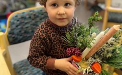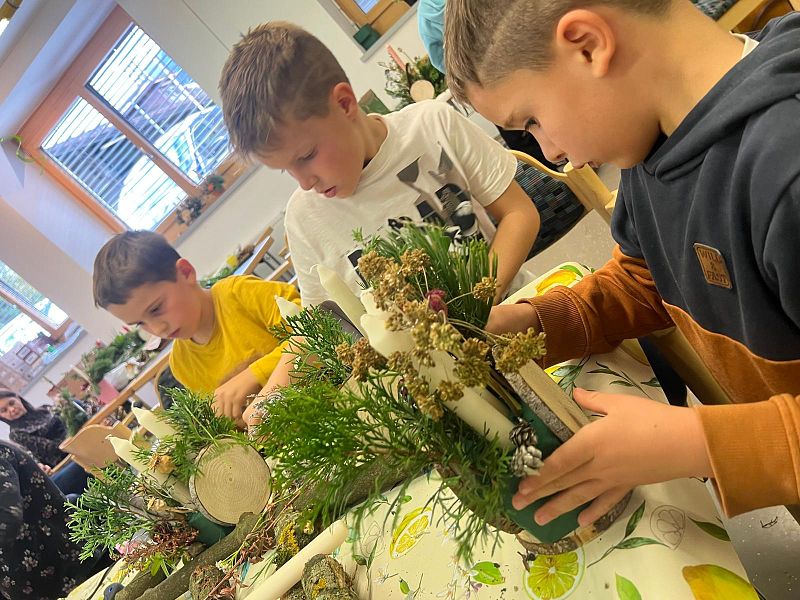 Zwischen raschelndem Laub und moosbedeckten Baumstämmen wurden fleißig Schätze gesammelt. Die Kinder stöberten begeistert auf dem Waldboden, schnitten mit ihren Gartenscheren Zweige, Blätter und Gräser, die sie „gut gebrauchen konnten“. Und selbst als ein kleiner Regenschauer vorbeizog, ließen sich unsere jungen Bastler nicht bremsen – bestens ausgerüstet und voller Tatendrang ging das Abenteuer weiter.